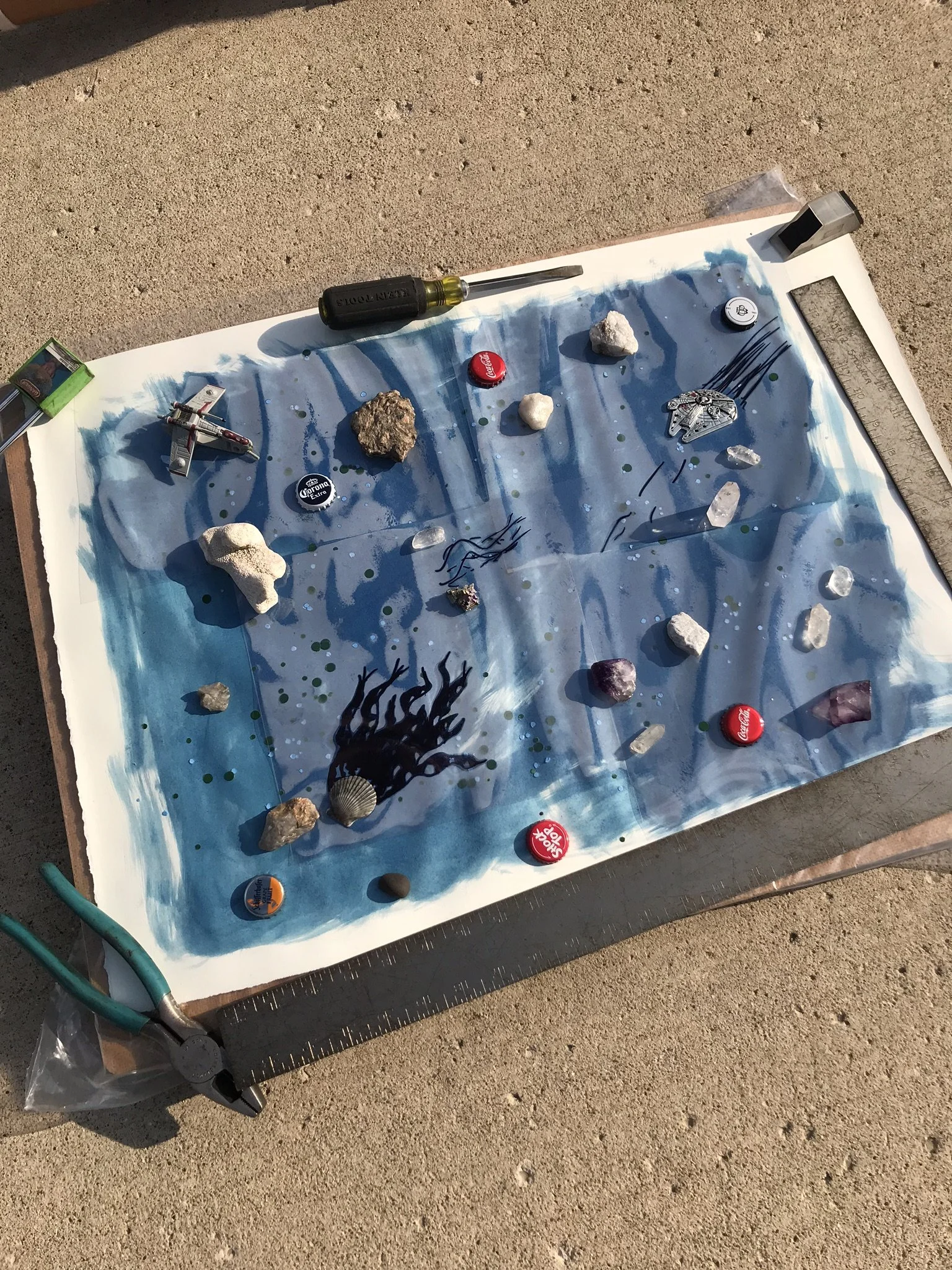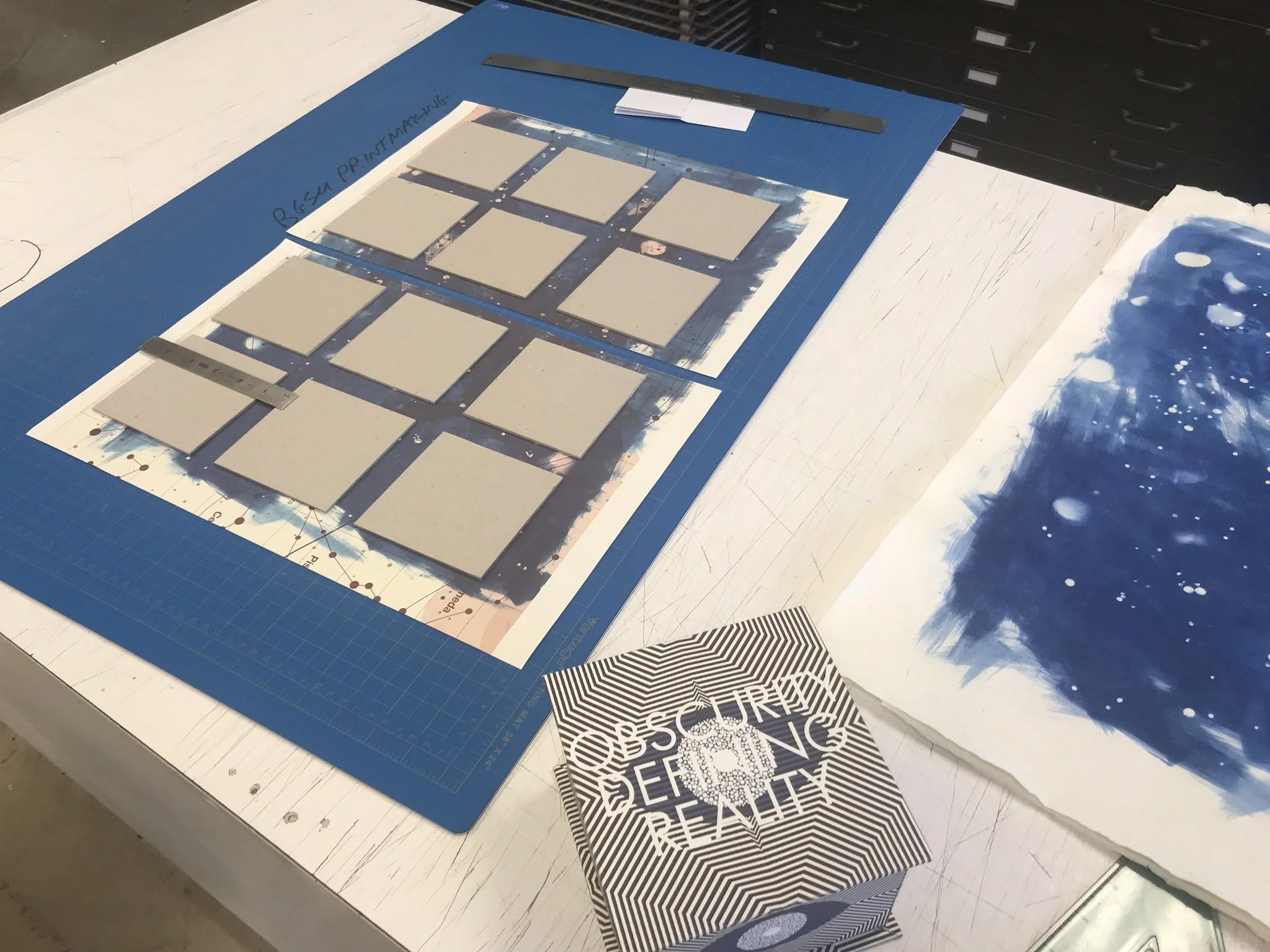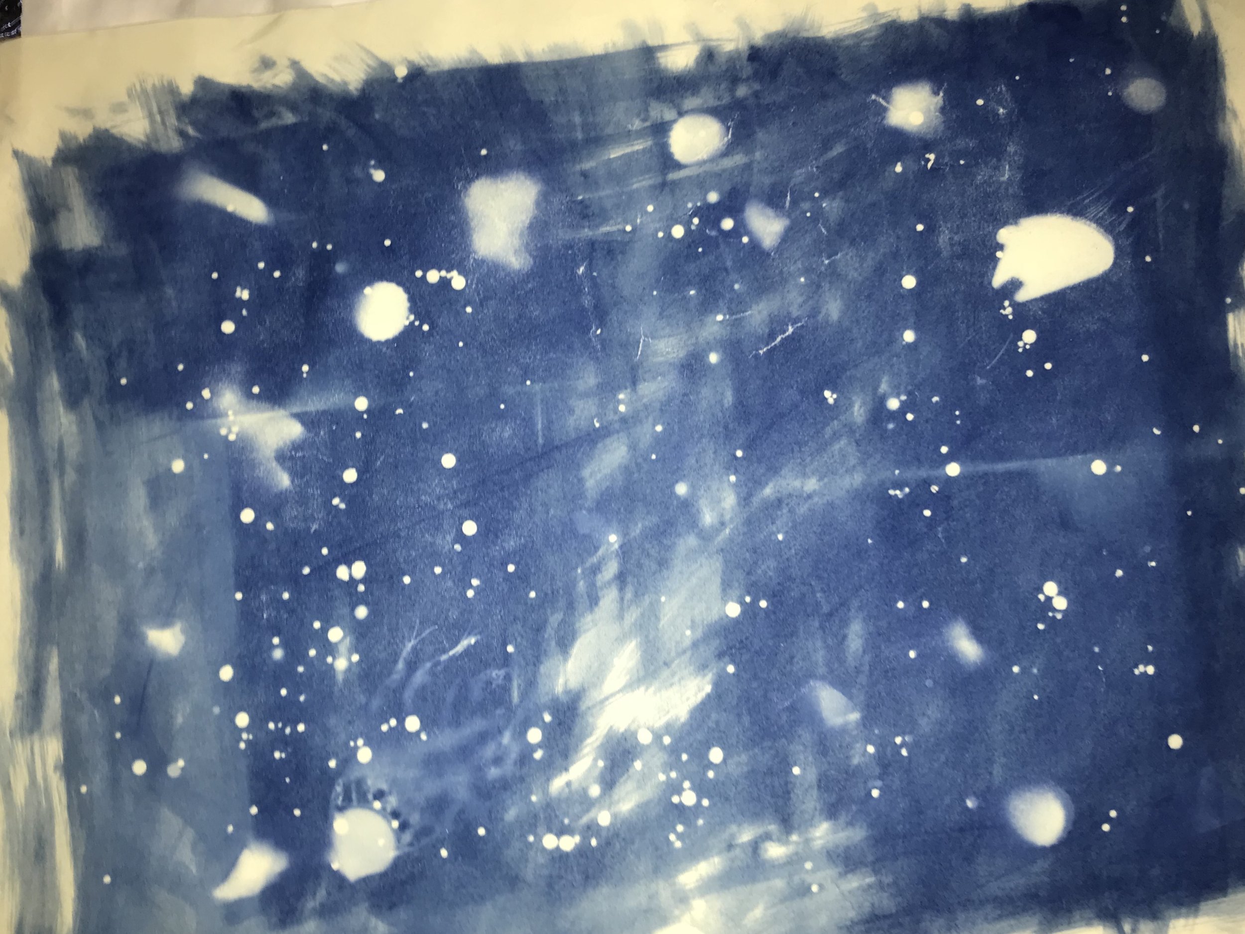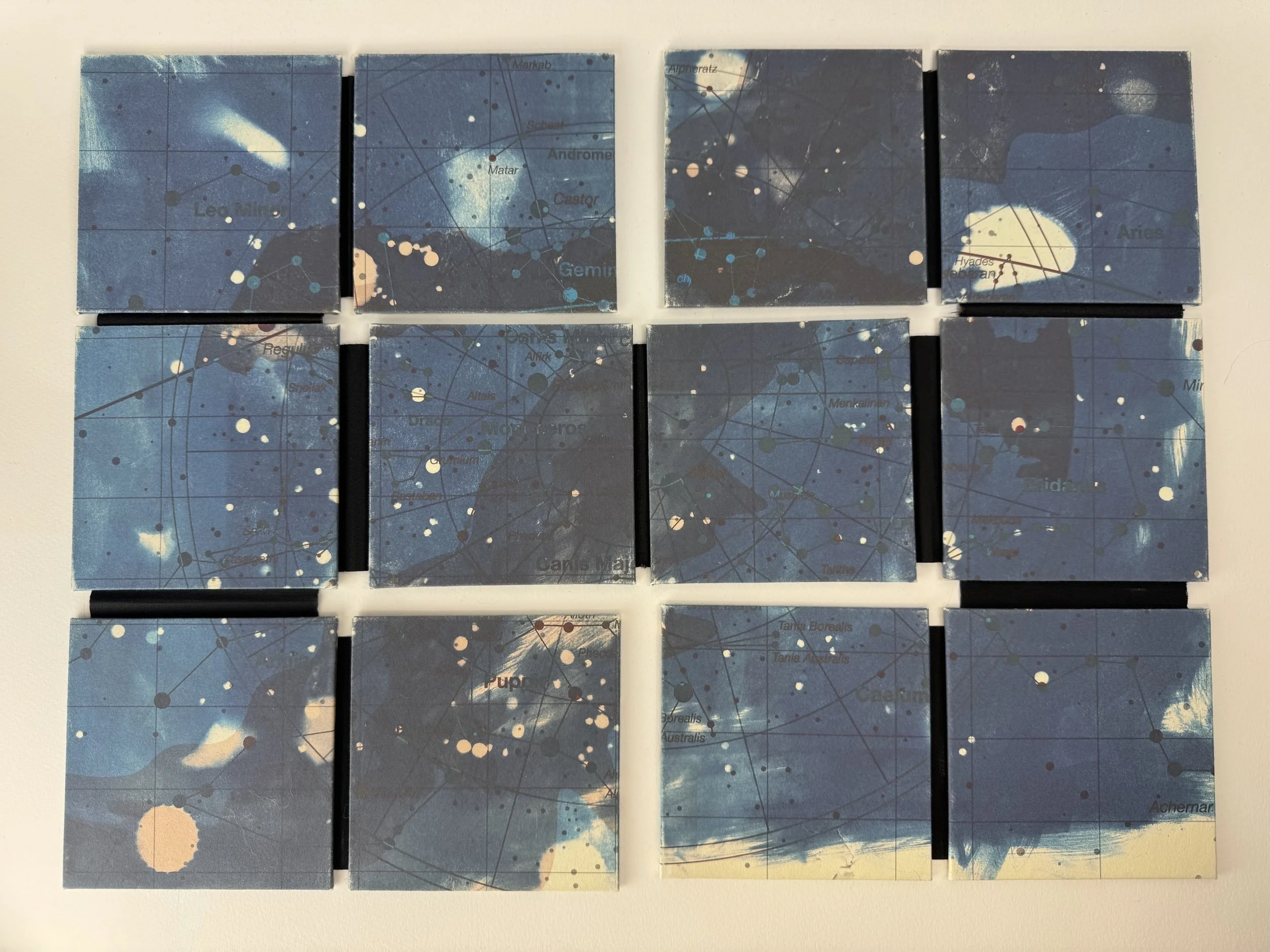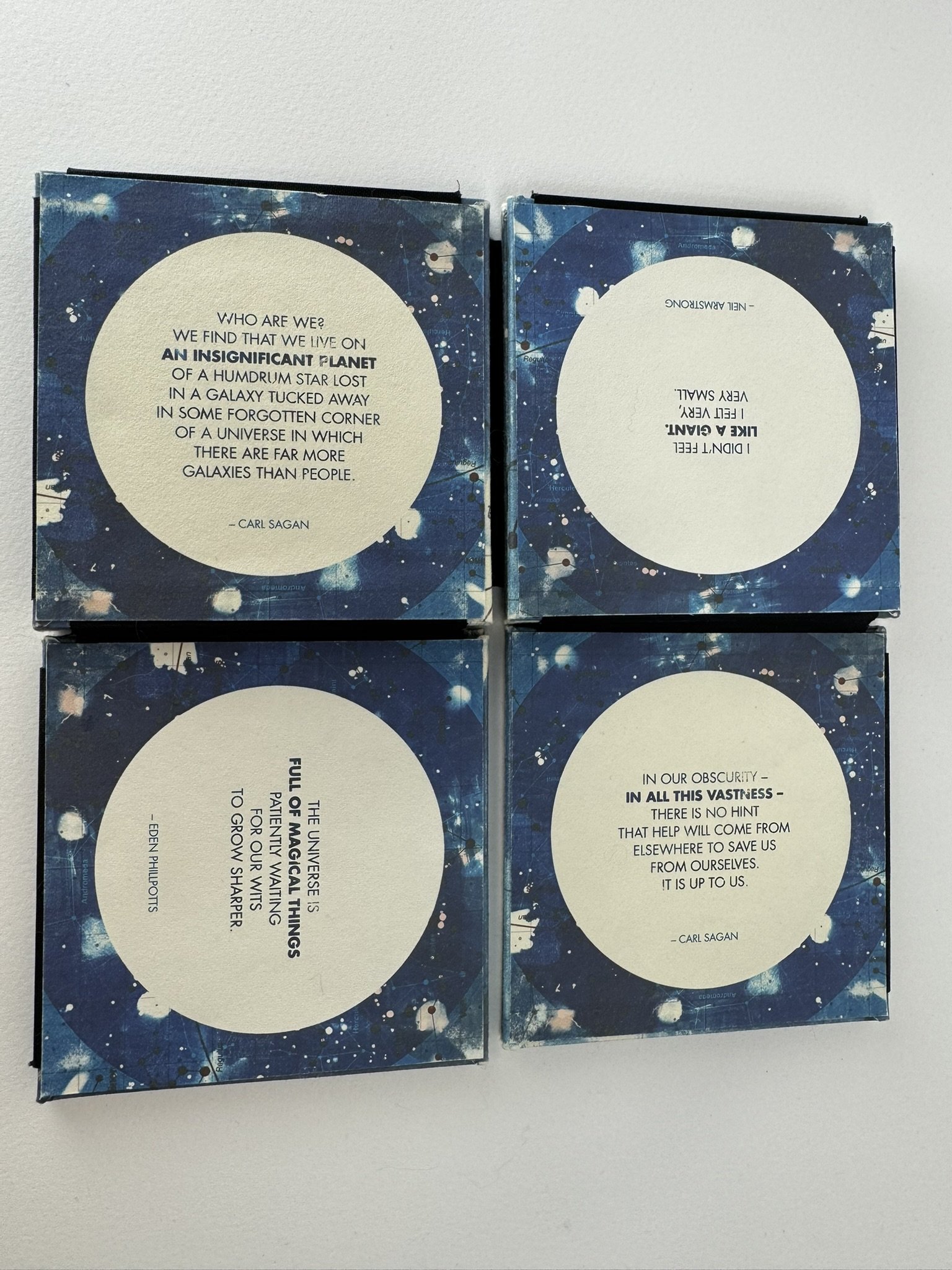 When closed, the book is held by a band of paper I cyanotyped, directly tying its aesthetics with the light of the sun. When unfolded, the panels multiply awkwardly in all directions, scattering the quotes in every direction, encouraging the reader's contemplation of the directionless expanse of the universe. On the reverse sides and in the margins, are graphics depicting a constellation map looking up from the North Pole, imposed over the cyanotype pattern used in the banding to contain the book.